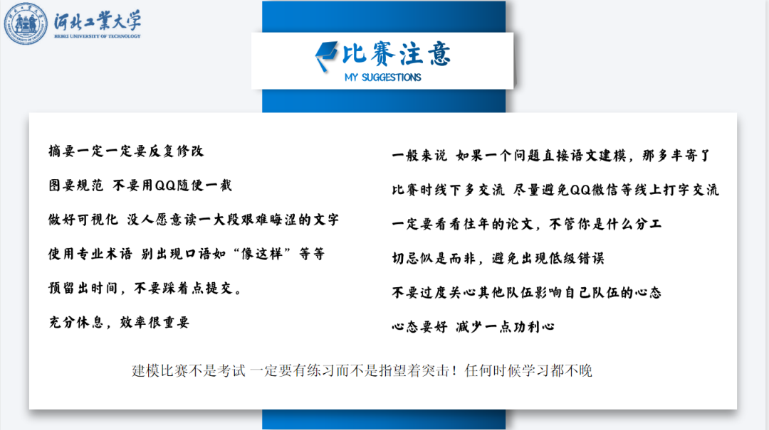 第一部分是葛天同学对于数学建模竞赛的经验分享。葛天同学为大家讲述了数学建模的概念、竞赛需要的准备与技巧以及参赛后的总结收获。最后展示数学竞赛参赛论文内的一些细节问题,让大家对于参赛内容有着更进一步的了解,用更丰富的知识储备增强自己的竞争力。