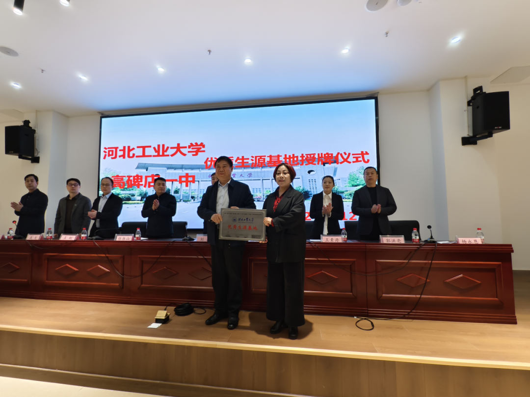 4月12日,河北工业大学优质生源基地授牌仪式在高碑店一中举行。开云官方网页版官网党委书记杨占力、安全工作处处长刘征、学院党委副书记兼副院长王素丹、副院长王刚、招生就业中心招生办公室副主任高见以及高碑店市副市长张振山、高碑店市教体局、高碑店一中负责人等出席授牌仪式。