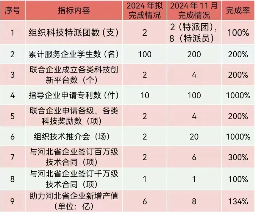 2024年,学院走访省内企业66家,学院组织科技特派团2支、特派员8名,全年完成率100%;累计服务企业学生数200名,全年完成率200%;联合企业成立各类科技创新平台4个,全年完成率150%;指导企业申请专利数100件,全年1000%;组织技术推介会12场,全年完成率600%;与河北省企业签订百万级技术合同6项,其中1项为千万级技术合同,全年完成率300%,助力河北省企业新增产值8个亿,全年完成率134%。学院高标准、高质量完成了各项工作指标。