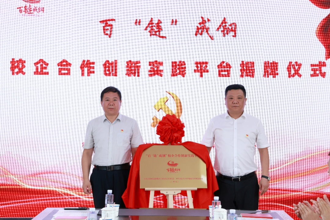 杨占力和宋涛共同为“百‘链’成钢”校企合作创新实践平台揭牌。