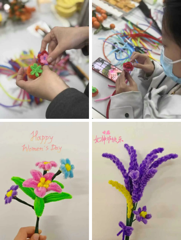 活动现场,老师们暂时放下繁忙的教学与科研工作,围坐一起,一边品尝香甜可口的茶点,一边话家常、聊生活、交流工作心得。在扭扭棒手工制作环节,大家兴致勃勃,一根根柔软的扭扭棒,在老师们灵巧的双手中,经过弯折、缠绕、塑形、组合,逐渐变成了一朵朵形态各异、栩栩如生的手工花,每一件作品都充满巧思与温情。老师们互相请教制作技巧,分享创作灵感,从生疏尝试到熟练操作,沉浸式体验手工创作的乐趣,用巧手“扭”出永不凋零的花朵,也定格下属于自己的节日浪漫。