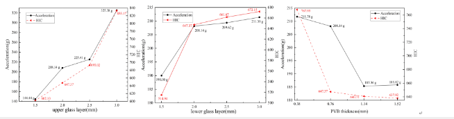 随着上层和下层玻璃厚度的增加,峰值加速度和HIC均有所增加。这归因于挡风玻璃整体厚度的增加,增强了其整体强度,从而导致更高的峰值加速度和HIC。随着下层玻璃厚度的增加,峰值加速度和HIC均有所增加。随着夹层PVB厚度的增加,峰值加速度和HIC均有所下降。这一现象源于挡风玻璃在夹层PVB膜厚度增大时,其能量吸收缓冲效果的增强,从而改善了头部保护,并最终导致峰值加速度和HIC的降低。